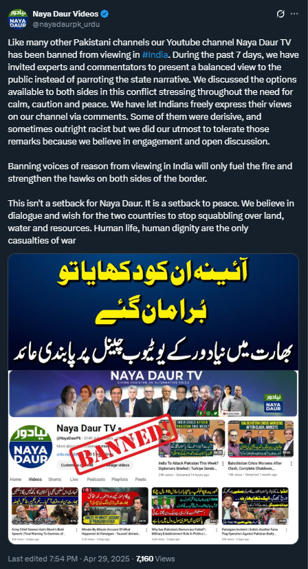 Similarly, several Pakistani Twitter/X accounts, including the official account of the Government of Pakistan, and Pakistan’s Minister of Defence, were banned in India.
